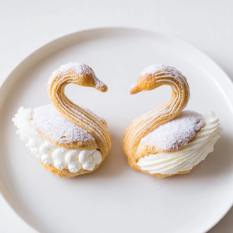 Save to Pinterest An exquisite platter of delicate, swan-shaped petit fours featuring airy choux pastry filled with vanilla cream and glazed with fondant. Perfect for elegant gatherings, afternoon teas, or as a show-stopping dessert centerpiece.