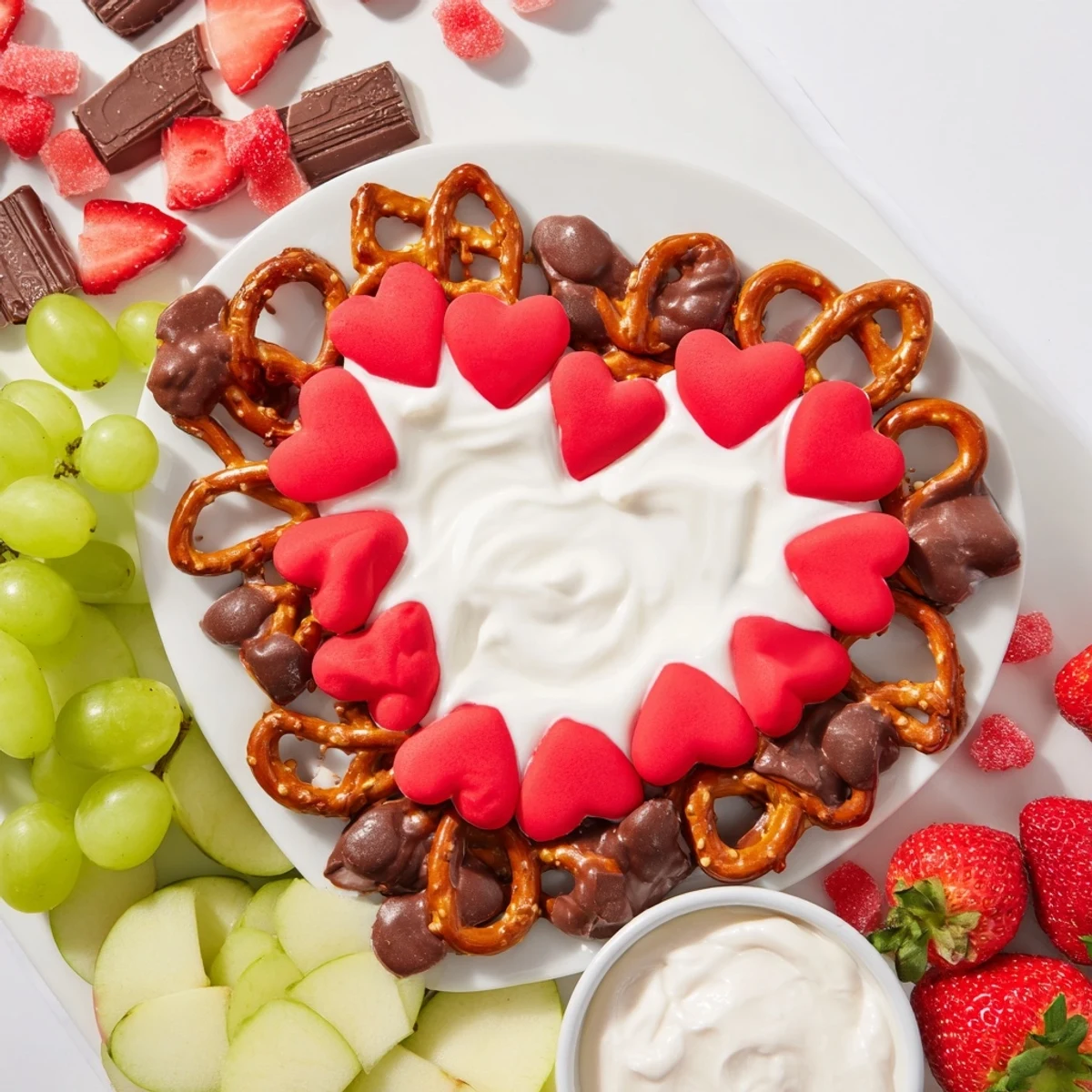 - 1. Arrange the mini pretzel twists in the shape of a large heart on a large platter or wooden board.