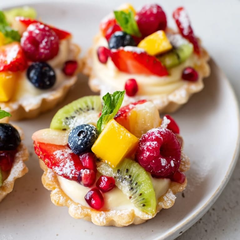This dessert not only pleases the palate but also delights the eyes. The interplay of textures — from the crunchy tart shells to the smooth cream filling and juicy fruits — makes every bite memorable. The combination of strawberries, raspberries, blueberries, kiwi, mango, and pomegranate seeds ensures a burst of bright flavors balanced by the creamy sweetness of the filling.