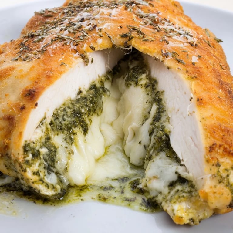 Save to Pinterest The kitchen was quiet except for the hum of the oven warming up, and I found myself tearing fresh mozzarella into pieces while my husband leaned against the counter asking what smelled so good already. It was just the pesto, but that burst of basil and garlic was filling the entire house with promises of dinner to come. I'd been making this stuffed chicken for years, usually on those evenings when I wanted something that felt special but didn't require three hours of prep time. That night, watching the cheese bubble through the crispy brown crust, I realized this wasn't just another weeknight meal—it was the dish that made my family actually stop scrolling through their phones and sit down together.