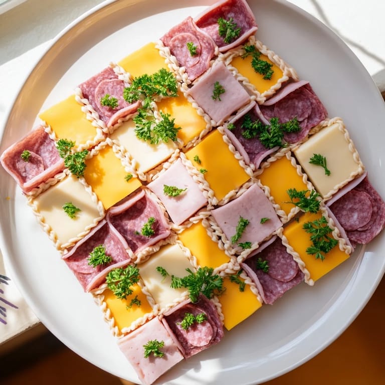 Save to Pinterest The first time I assembled this platter, I wasn't trying to be fancy—I just wanted something that looked like it took more effort than it actually did. I'd been staring at a half-empty charcuterie board at a friend's dinner party, noticing how the meats and cheeses just sat there in sad little piles. Then it hit me: what if I cut everything into perfect squares and arranged them like a game board? The mustard lines came next, purely as a joke, but when I piped them on, it looked like someone had stitched this whole thing together by hand. That's when the name hit me, and suddenly I had something worth sharing.