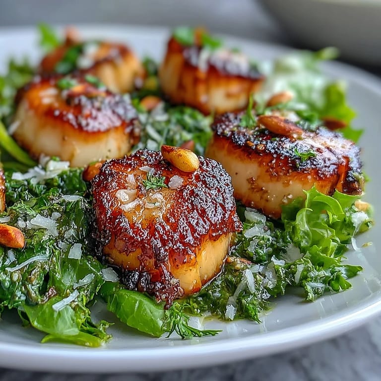 Save to Pinterest The skillet was already smoking when I realized I'd forgotten to pat the scallops dry. That first attempt taught me more about texture than any cookbook ever could. Now, the sound of a scallop hitting a screaming-hot pan, that instant sizzle, is one of my favorite kitchen victories. This dish came together on a Tuesday when I wanted something that tasted like a celebration but didn't require hours of prep. The pesto vinaigrette was a happy accident, born from leftover basil and a hunch that it would brighten the bitter greens.