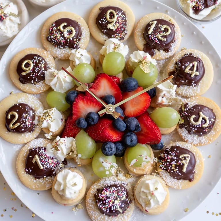 Save to Pinterest A festive dessert platter featuring elegant, sparkling treats arranged in the shape of a clock—perfect for counting down to midnight on New Years Eve.